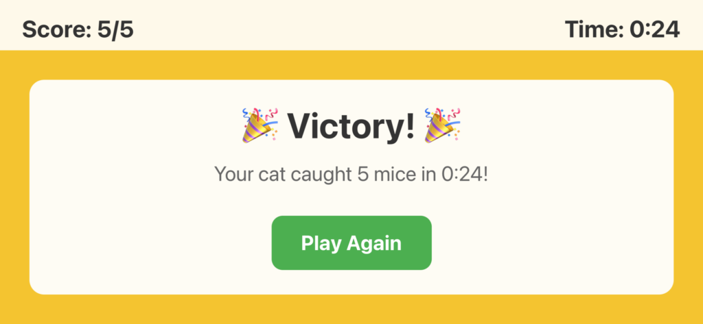 If it gets approved, I’m thinking about adding difficulty levels – maybe a “hard mode” with faster mice, or multiple mice on screen at once. Could also add different animals. Birds, fish, maybe even a laser dot simulation.